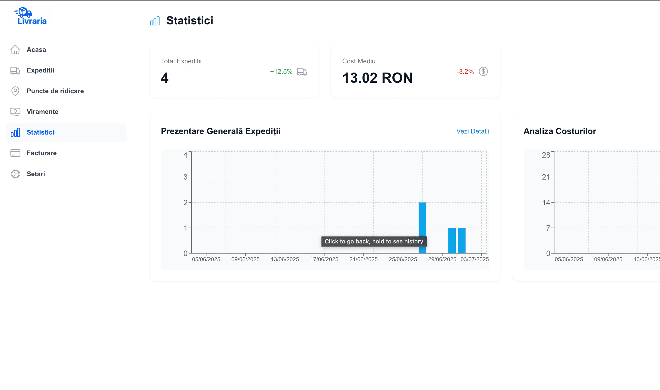 Acces instant la statistici despre livrări, costuri și performanța curierilor. Ia decizii informate pentru afacerea ta.