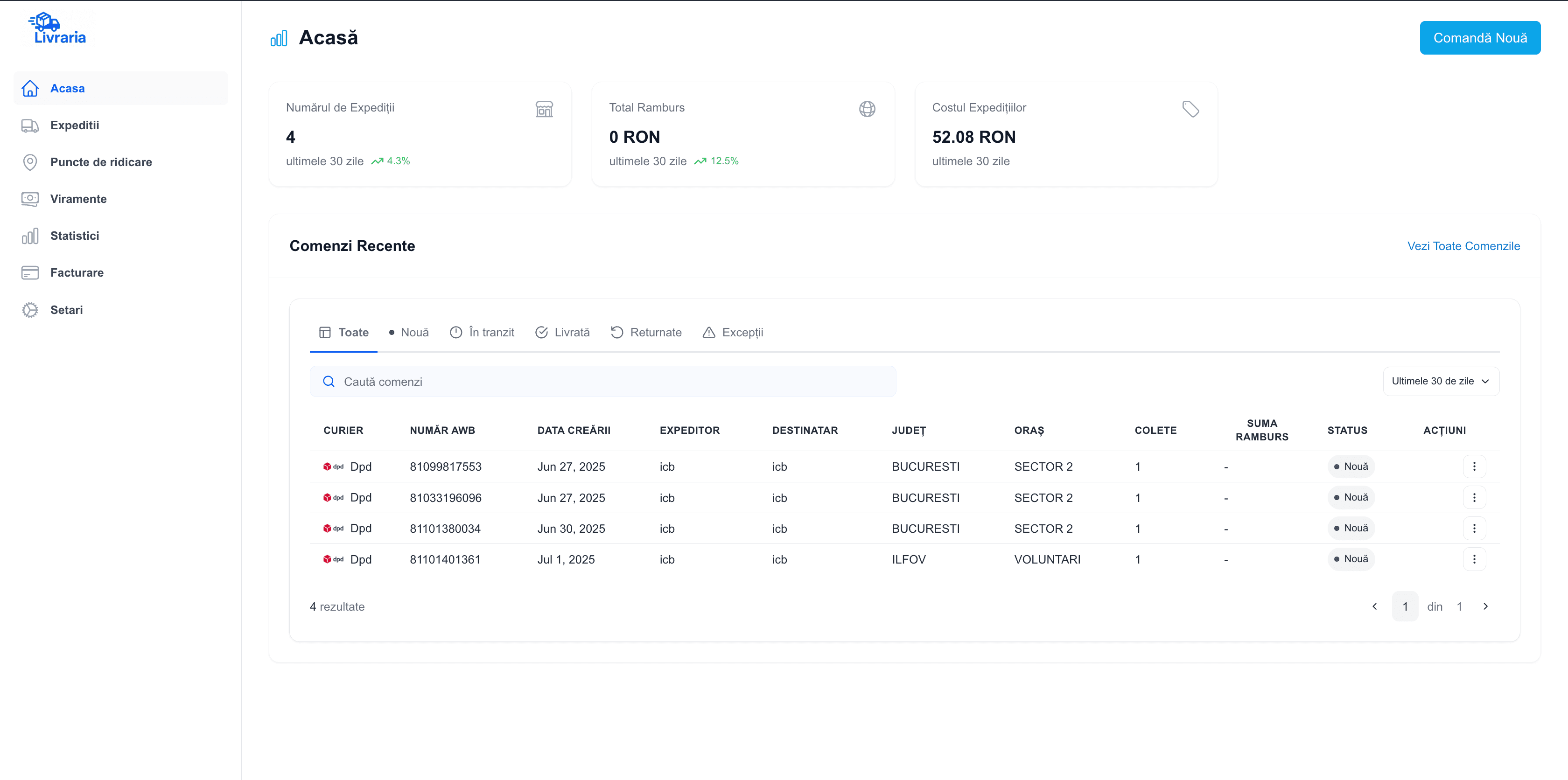 Creează AWB-uri în masă, printează etichete și urmărește statusul fiecărei expedieri din platformă.
